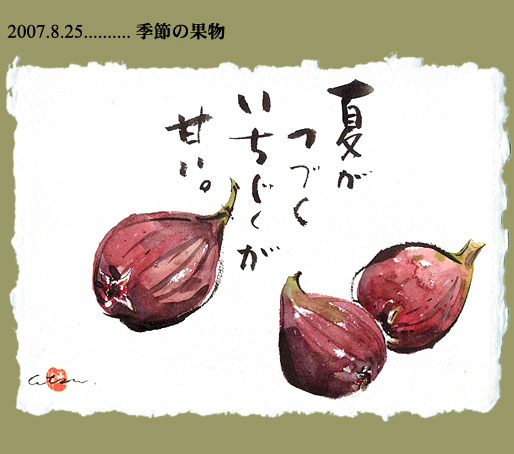 せめて絵を描き終わるまで我慢すればよいのに、描いている途中に一個剥いて食べてしまった。いちじく、甘くて美味しい! この連日の暑さで秋の果物が少し早めにたっぷり甘くなっているようだ。先週は岡山の知り合いから頂いた白桃を堪能しました。箱を開けると、ピンクのお布団に包まれた色白のお姫様のような白桃ちゃん。高貴な香りに包まれて幸せでした〜ほっぺたが落ちるようでした〜ありがとう。自分ではめったに買えないから食べてしまう前に絵を描くべきだった。ああ〜もう遅い〜!