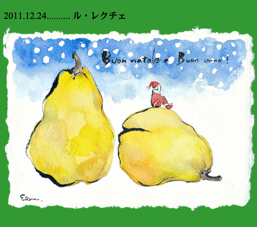 「すみません。一番美味しいル・レクチェをひとつ下さい」(絵は見栄を張って2個描いたけど、買ったのはひとつ!)