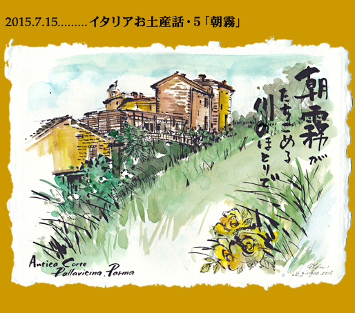 大きな鳥の声で目が覚めた。お散歩に出てみよう…冷たい空気。朝霧が立ち込めて、足元の草を濡らしている。イタリアに来てずっとカンカン照りの晴天続き、この湿度が本当に心地よい。