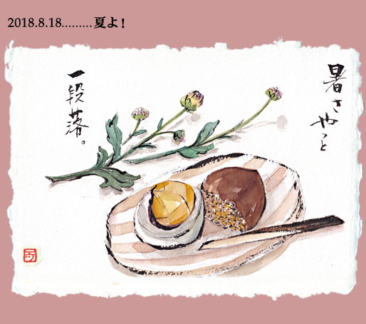 さて、その平成最後の夏はいかがなものだったでしょうか? 暑いばかりで…描いてばかり…の夏だったかな〜。私のお盆休みは実家へ。一人暮らしの母は、痛めていた腰は若干回復して通常の生活に戻ってはいるけど…歳だしね〜台所を手伝ったり、掃除をしたり、家庭菜園に水を運んだり、茄子をたくさん収穫して南蛮漬けを作ったり。…そして定番の絵手紙集中指導?